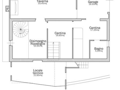 Sempre allo stesso piano, troviamo un garage di 17 mq, un bagno e vari locali ad uso cantina e ripostiglio.